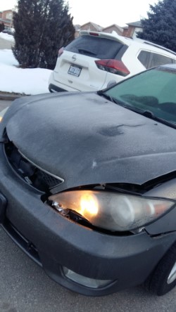 We rushed to the parking lot she had pulled the car into and met her and the other participant in the accident. We little expectation, the experience was as good as an accident conversation could go. All parties were okay. We observed the damage to our 2005 Toyota Camry with 308,000 kilometers and it was significant at the front end. We then looked at the damage to the 2019 Cadillac she had hit and it was almost unnoticeable.
