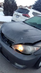 Information was exchanged and both victims left the scene of the crime. Samantha and her mother left in the “good car” and I attempted to drive the wreck home. Well the car drove perfectly, though I did fear the front hood, which was bent and cracked would fly open during the short drive home, but it did not.